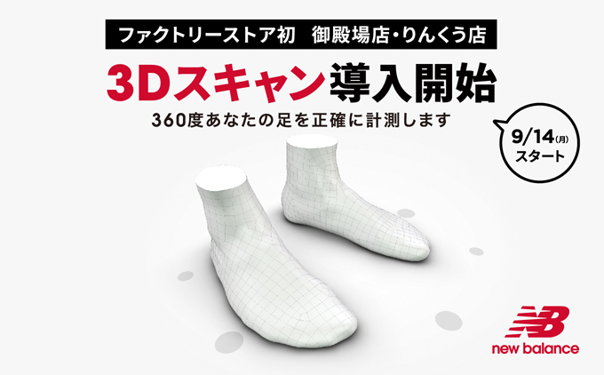 先月リニューアルオープンした「ニューバランスファクトリーストア御殿場」「ニューバランスファクトリーストアりんくう」にて、ニューバランスファクトリーストア初となる、足型計測ツール「3Dスキャン」が9月14日(月)より導入されます。360度あなたの足を正確に計測します。ぜびこの機会にあなたも足のサイズを測ってみませんか?