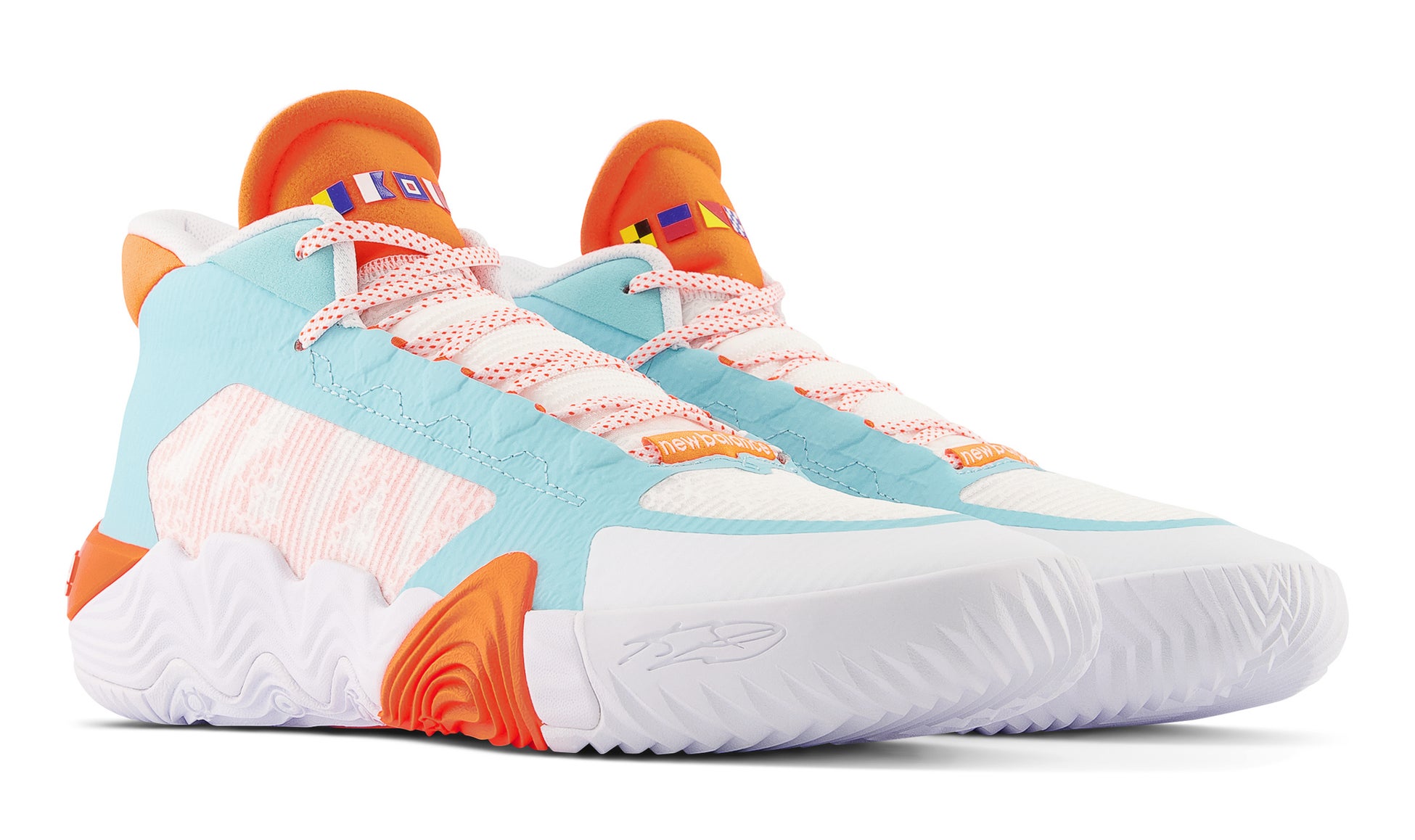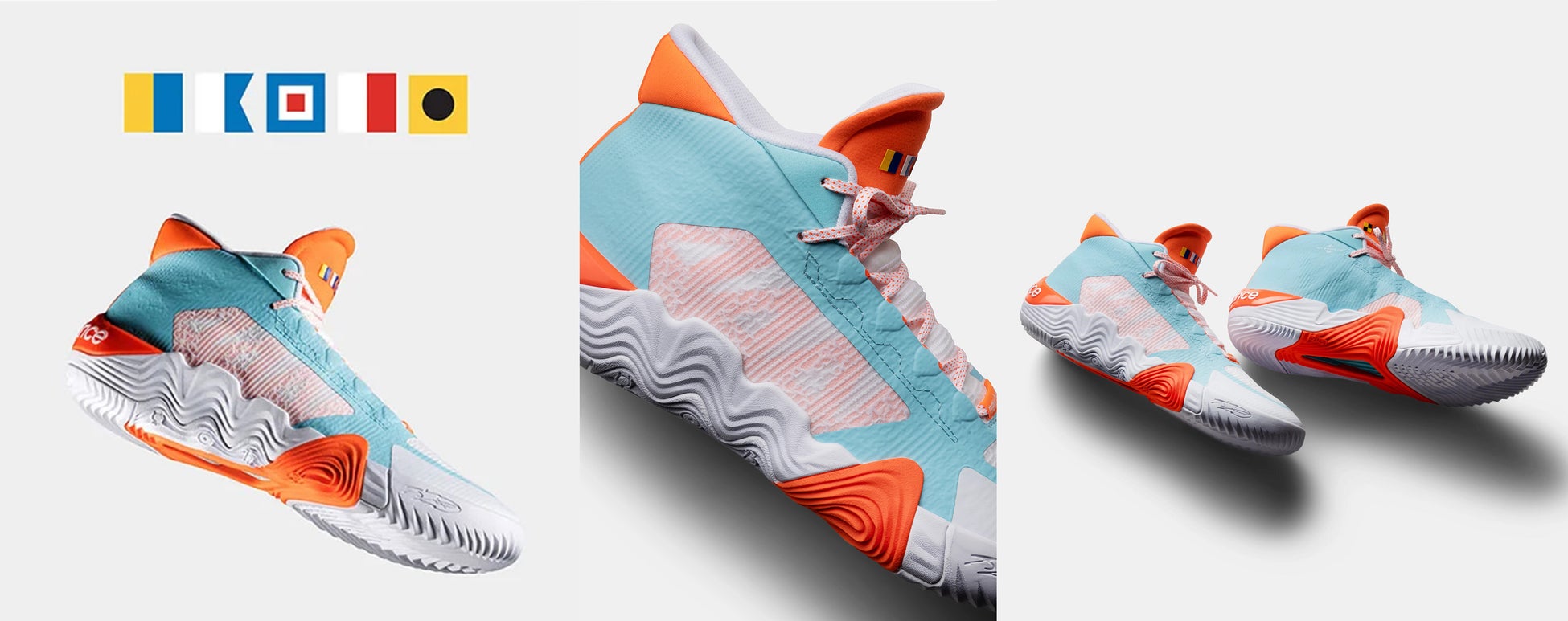 デザイナーはJonathan Grondinで海からインスパイアされた印象的なブルーとオレンジのカラーリングは、穏やかな海の風景と太平洋に沈む夕日を連想させます。ウェーブのステッチを配したユニークなディティールのインソールが特徴的で、シュータンに描かれた航海の旗に「カワイ」、もう片足に「レナード」と記されています。