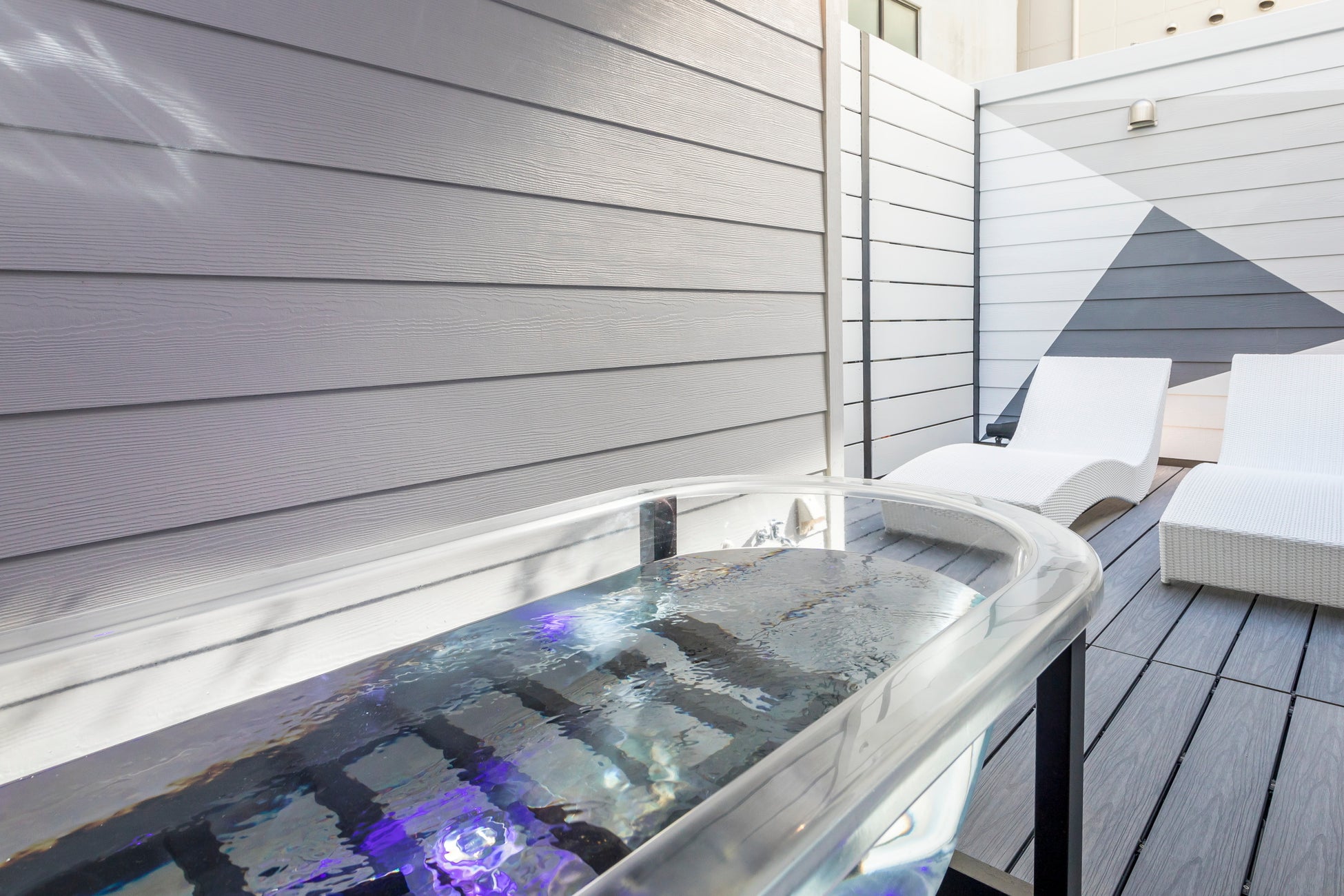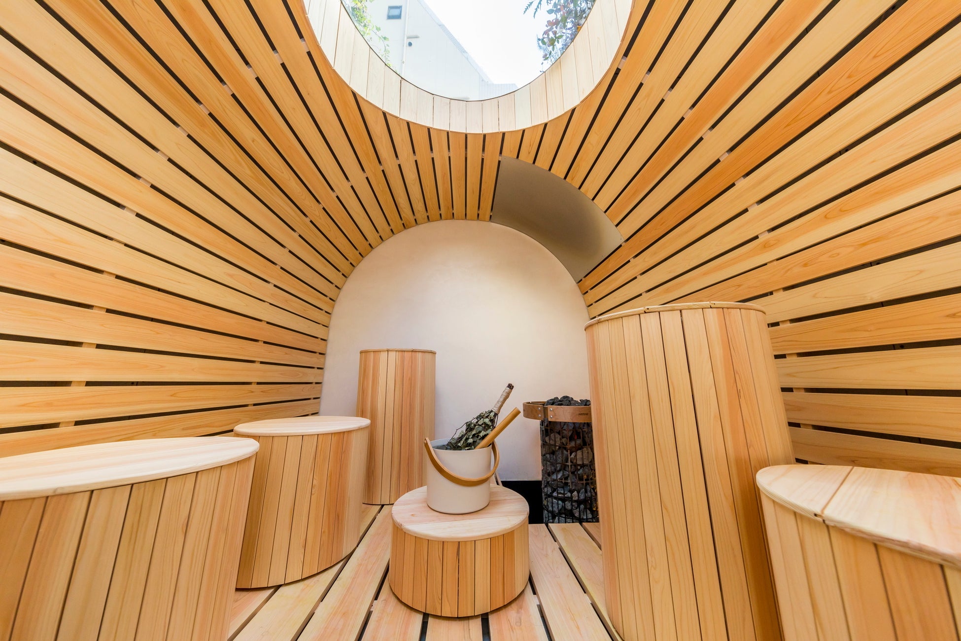 三井不動産グループの株式会社ShareTomorrowが運営する、移動式ユニットを活⽤したリアルな仲間とリアルに集えるリアルコミュニティプレイス。今回サウナスペースとして活用するBADE POOLスペースには、本格フィンランド式ヒーティングルームを設けています。天窓付きの檜張りヒーティングルームのほか、フィンランドHARVIA製ストーブにヴィヒタ水(白樺エキスを抽出した水)を用いたセルフロウリュも完備。夜はライティングシステムを活用することで、幻想的な空間を演出します。