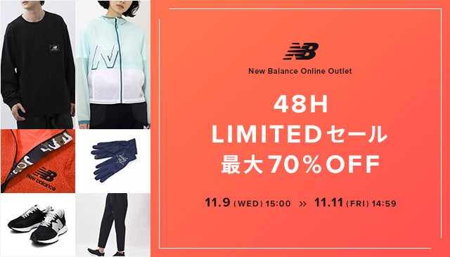 11月9日(火)15:00 ~ 11月11日(金)14:59までの48時間限定で、人気のライフスタイルシューズやアパレルなど最大70%OFFのプライスダウンとなるタイムセールを実施します。その他、期間限定でキャンペーンをご用意しています。また、セール期間中は5,000円以上で送料無料です。この機会にぜひニューバランス公式オンラインアウトレットでのショッピングをお楽しみください。