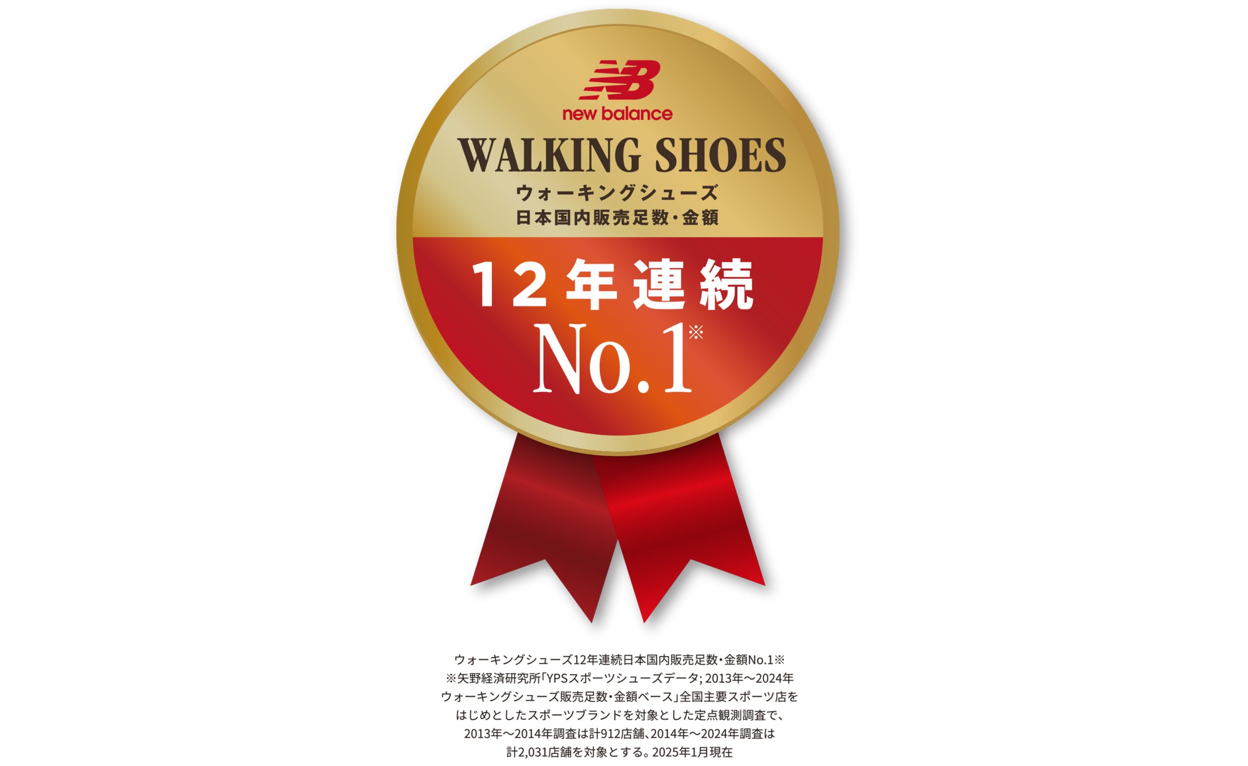 ニューバランスジャパンは、ウォーキングシューズのカテゴリーにて、2013年から12年連続で日本国内販売足数・金額No.1(※)を獲得いたしました。