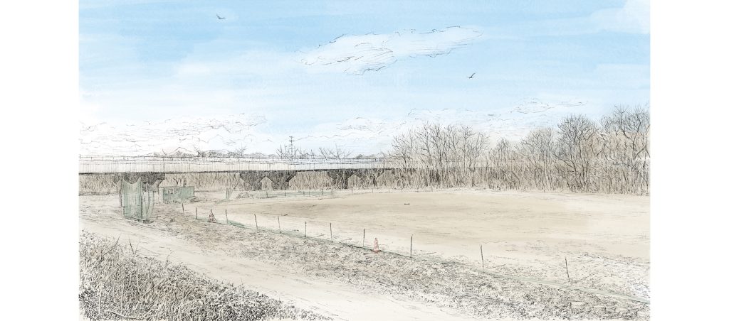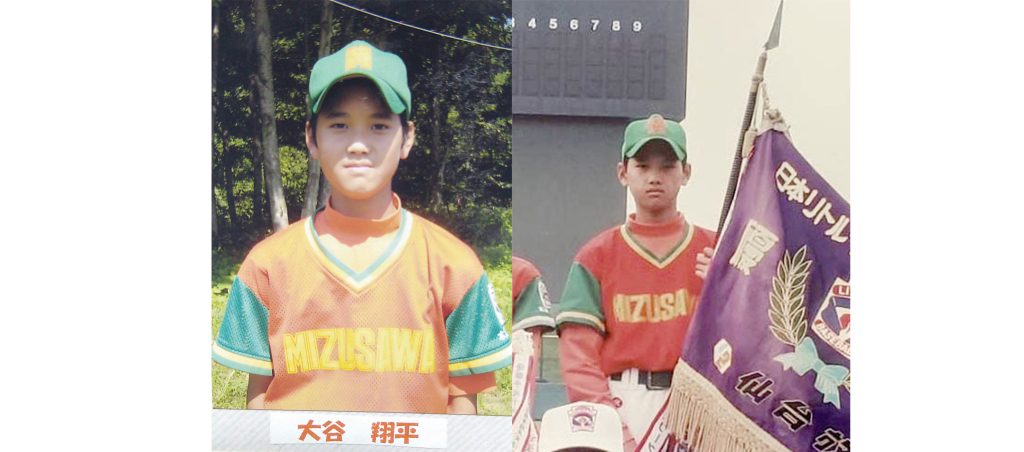 左)Ohtani Signature Logoを制作した漫画家の井上雄彦氏による大谷選手が少年時代に野球をしていた練習場の風景スケッチ 右)大谷翔平選手の少年時代のチームユニフォーム姿