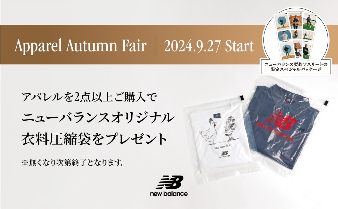 【オフィシャルストア対象】Apparel Autumn Fair開催 9月27日(金)からオフィシャルストアにて、出張や秋のご旅行に活用できる衣料圧縮袋をプレゼントする、Apparel Autumn Fairを開催いたします。ニューバランスオフィシャルストアでは、羽織のアイテムなど秋物の新作が入荷しております。ぜひこの機会にご来店ください。 キャンペーン詳細 【期間】9月27日(金)~ ※各店無くなり次第終了 【対象店舗】ニューバランスオフィシャルストア各店※ニューバランス心斎橋、T-HOUSE New Balance、ニューバランス公式オンラインストア、オンラインアウトレットは対象外となりま