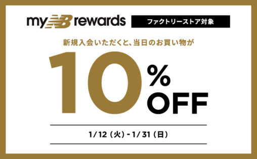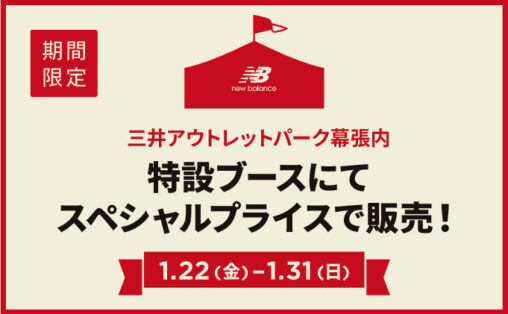 1/22(金) - 1/31(日)の期間限定、三井アウトレットパーク 大阪鶴見内特設ブースでこれからの季節に重宝するアイテムを、スペシャルプライスにて販売いたします! 特設ブース開催情報 【場所】 三井アウトレットパーク大阪鶴見 3階プラザ【開催日】 1/22(金) - 1/31(日)【開催時間】 平日11:00 - 20:00、土日10:00 - 20:00【シューズ情報】 MAX60%OFFとお買い得品を多数ご用意。【アパレル情報】 MAX80%OFF ¥500、¥1,000、¥2,000、¥3,000、¥5,000均一にて、冬の寒い日にも活躍するアイテムをご用意。 ニューバランスファクト