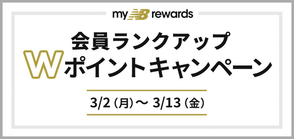 3/2(月)〜 3/13(金)の期間中、ご購入時のポイントが2倍となるWポイントキャンペーンを開催しております。 是非、この機会にお買い物をお楽しみください。 【期間】:3/2(月)〜 3/13(金) 【参加条件】:期間中にご購入いただいたmyNB会員様 ※今回のお買い物から新たに会員登録される方も参加可能 【参加方法】:レジにてマイページご提示で自動エントリー 【対象商品】:各店舗の全商品対象 【ご注意事項】 ・キャンペーンで付与させていただくポイントはランクアップ対象となり、2020年5月31日(日)までの有効期限となります。 ・公式オンラインアウトレット、ファクトリーストアでは実施いたし
