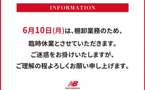 2019.07.19 7/22(月)名古屋店 棚卸しのため臨時休業 ニューバランス名古屋は下記日付を、棚卸業務のため臨時休業とさせていただきます。お客様には大変ご迷惑をお掛けいたしますが、何卒ご理解賜ります様お願い申し上げます。 臨時休業:2019年7月22日(月)