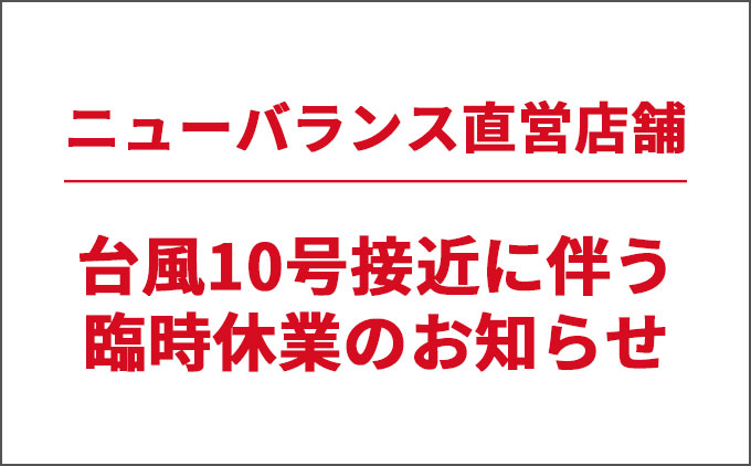 台風10号の接近に伴い、下記店舗において臨時休業、営業時間の変更がございます。 【臨時休業日】2019年8月15日(木)【対象店舗】ニューバランス大丸神戸、ニューバランスファクトリーストア倉敷、ニューバランスファクトリーストア神戸 【営業時間変更 】 2019年8月15日(木)14:00閉店【 対象店舗 】 ニューバランス大阪、ニューバランスファクトリーストア神戸三田 、ニューバランスファクトリーストアりんくう 【営業時間変更 】 2019年8月15日(木)15:00閉店【 対象店舗 】 ニューバランス グランフロント大阪 【営業時間変更 】 2019年8月15日(木)17:00閉店【 対象店