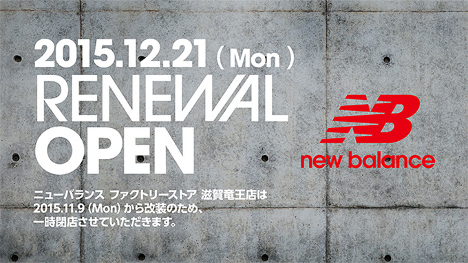 2015.11.02 ファクトリーストア滋賀竜王 リニューアル改装工事に伴う一時クローズのお知らせ ニューバランスファクトリーストア滋賀竜王はリニューアル改装工事のため11月8日(日)をもちまして一時クローズとさせて頂きます。皆様には大変ご迷惑おかけいたしますが、新しくなったニューバランスファクトリーストア滋賀竜王で皆様のご来店を心よりお待ちしております。 クローズ:2015年11月9日(月)〜2015年12月20日(日) リニューアルオープン:2015年12月21日(月)予定