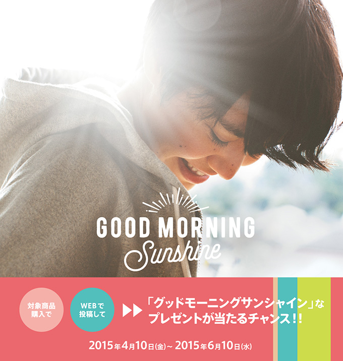 2015.04.10 「GOOD MORNING SUNSHINE」キャンペーン 4月10日(金)〜6月10日(水)の期間中、店頭で対象のWomen`sシューズをご購入頂くと「グッドモーニングサンシャイン」なプレゼントが当たるキャンペーンを開催! 詳しくはコチラ