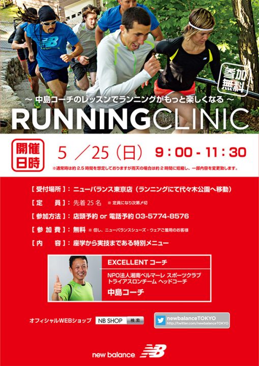 開催場所:ニューバランス東京→代々木公園 AM9:00〜AM11:30(雨天時はAM11:00迄) 毎回好評いただいております、ニューバランスランニングアドバイザー中島靖弘氏による ランニングクリニックの開催が決定いたしました!! 中島靖弘氏プロフィール   湘南ベルマーレスポーツクラブ トライアスロンチームヘッドコーチ   日本トライアスロン連合 マルチスポーツ委員長   オリンピック選手をはじめ、多くのアスリートのフィジカルトレーナーとして活躍中!! 疑問点や改善したい点など中島氏に直接投げかけられる良い機会。 体や走り方・トレーニング方法に悩みを抱える方も多いですよね。 初心者の方はもち